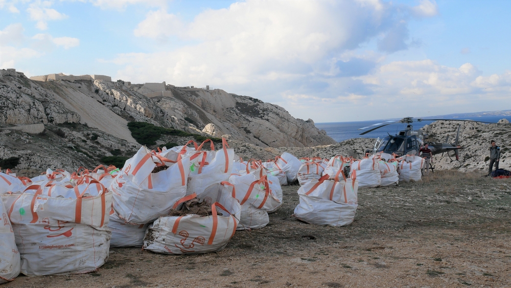 Un problème s’est alors posé : comment acheminer ces « big bag » des falaises jusqu’à l’embarcation ?« C’était impossible manuellement car ils pesaient chacun près d’une demi-tonne. On avait pensé à les tracter via une corde, mais le frottement sur le sol aurait abîmé la végétation », explique Cynthia Llas, coordinatrice du programme “Life” au sein de l’Agence régionale pour l’environnement et la biodiversité (ARPE-ARB). « On a évalué tous les enjeux et les contraintes (économique, écologique, de manutention). L’héliportage s’est révélé être la meilleure option », poursuit-elle.