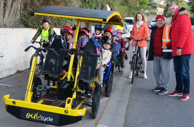 # Dans l’Hérault, la commune de Saint-Georges-d’Orques s’est dotée d’un Ouicycle à assistance électrique pour conduire les enfants à l’école : une première en France. C’est une bonne façon d’éviter la voiture et de sensibiliser les plus jeunes au deux-roues ainsi qu’à la route. Le quadricycle multiplace, adapté aux personnes en situation de handicap, sert aussi à promener les aînés. L’équipement séduit depuis bon nombre de collectivités. Relire notre article ici.