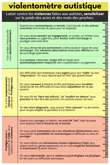 « Les violences verbales ou comportementales que peuvent ressentir les personnes autistes n’ont l’air de rien dans le quotidien, mais dans un monde neuroatypique, elles sont très douloureuses », indique Florence Demourant. Le violentomètre autistique sert à la fois aux concernés et à leurs proches au sens large. Il identifie les comportements possiblement toxiques, permet de poser des limites, d’aplanir les tensions et les incompréhensions, d’ouvrir la discussion, de déculpabiliser.
