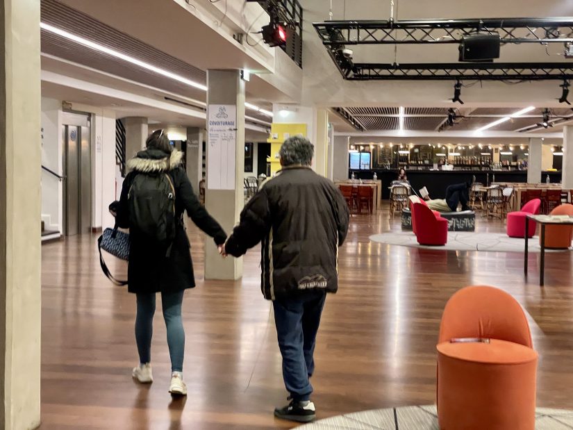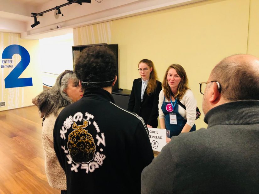 Soraya peut être effectivement tranquille. Les spectateurs ont été informés au moment de leur réservation de ce format ponctuel. Et des hôtes et hôtesses d’accueil sont postés dans la salle et l’espace détente, tout au long du spectacle. Identifiables par leur badge R accroché à leur tee-shirt violet, ils restent vigilants, prêts à intervenir au moindre besoin émis par ces personnes souffrant de troubles cognitifs, psychiques ou d’Alzheimer. Ils ont reçu en amont une formation de trois heures par l’association Relax, qui leur a donné les clés pour mieux appréhender et accompagner ce public. « Comment s’adresser à une personne qui ne parvient pas à ‘’oraliser’’ ? Quelle posture avoir ? Comment réagir à tel comportement ? », illustre Marie Clerget de Culture Relax qui compte trois salariés. Cette chargée de projet sur le spectacle vivant accompagne le théâtre pendant les trois saisons, puis lui passera la main. « L’idée est qu’il poursuive seul la proposition de Relax ».