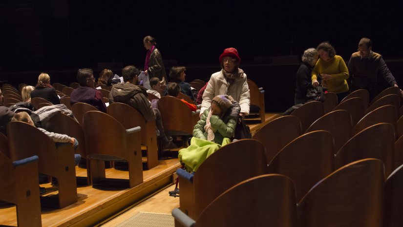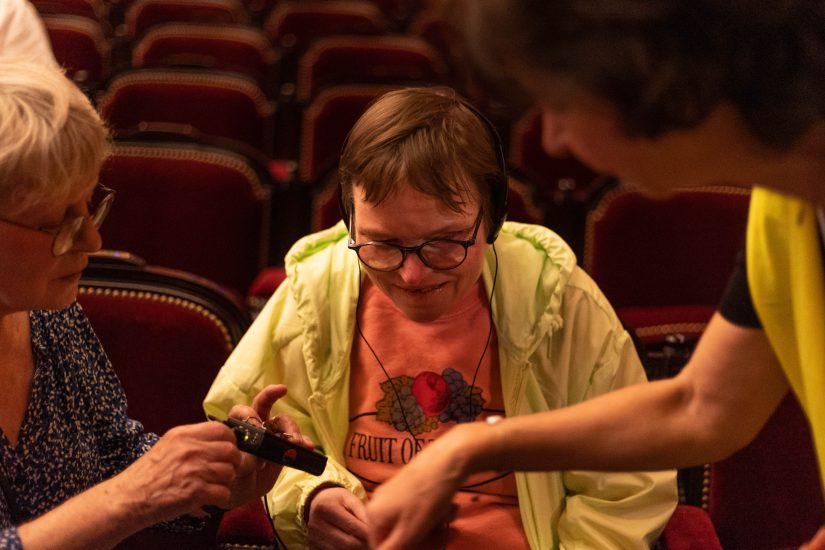 Soraya et Gabriel sont venus par l’intermédiaire de l’association d’entraide Soliane, comme dix autres familles adhérentes. L’autre groupe présent ce soir-là vient d’une MAS (maison d’accueil spécialisée) – six adultes lourdement handicapés et deux éducateurs. Le reste des spectateurs Relax sont des individuels. « On s’adresse en priorité à eux, précise Marie Clerget. Car on se rend compte qu’ils ont un vrai frein pour aller au théâtre, à cause d’un sentiment d’illégitimité. Ils ont peur de déranger le reste du public et les artistes. C’est pour ça que le cadre que nous proposons est important ». À l’accueil, sur un stand prévu à cet effet, un agent de La Criée demande à chacun s’il a besoin d’un casque ou de bouchons d’oreille, car « par moments le bruit est fort », souligne-t-il avant d’accompagner ces spectateurs singuliers dans la salle.