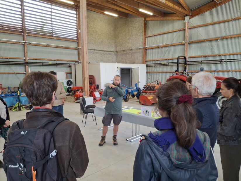 Dans le hangar rempli d’outils agricoles, les questions des participants à la visite fusent : est-il facile de trouver un terrain à acheter ? « C’est une très grosse problématique, reconnaît Yohann. Même quand on a un projet viable, les terrains libres sont rares. Moi j’ai eu énormément de chance de rencontrer un propriétaire qui voulait vendre… et j’ai beaucoup travaillé pour l’améliorer aussi. »