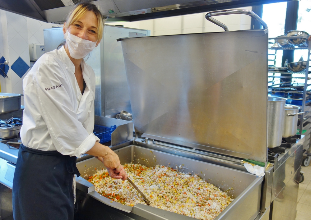 Une partie des volontaires se trouve en cuisine. « Ils ne sont pas tous chefs, mais la majorité est issue de près ou de loin du milieu de la restauration », glisse Michel Portos entre deux écumages de pommes de terre.