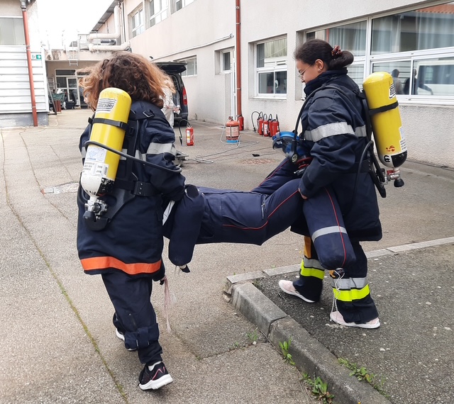 Les enfants s’équipent et constatent qu’effectivement, c’est lourd et que se déplacer est moins facile que dans la vie de tous les jours. « Il s’agit d’une extraction d’urgence sans brancard. On le fait dans une pièce enfumée ». Les jeunes présents se répartissent en binômes, sans que les instructeurs interviennent. Bizarrement, pour le spectateur que je suis, les garçons se mettent avec les garçons. Les filles avec les filles.