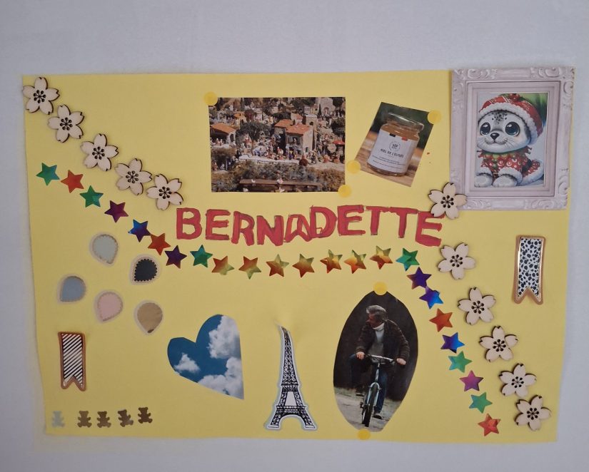 Devant chaque porte, une affiche faite lors d’un atelier. Ici, Bernadette a représenté les choses qu’elle apprécie. ©ZC