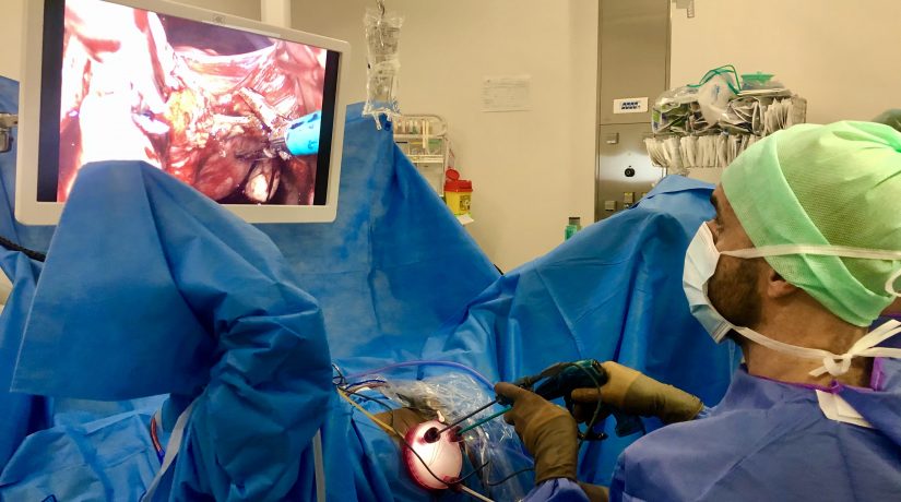 Avec ce dispositif, le chirurgien peut introduire dans le corps la caméra et deux instruments. L’un est une pince de thermofusion de type voyant, c’est-à-dire qu’elle serre les tissus, les scelle grâce à la chaleur et les coupe sous l’action d’une gâchette. Il utilise l’autre pince en cas de problème, comme une coagulation à réaliser rapidement.