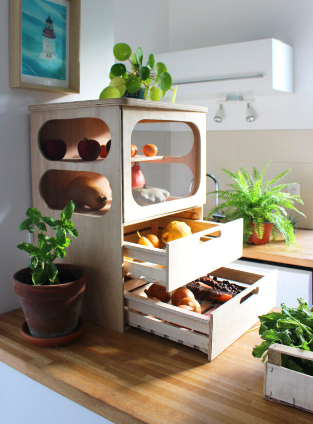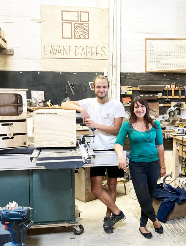 Depuis 2024, Zoé Colley-Meyer, designer de formation, co-dirige l’entreprise avec Paul Guilloré-Mouraz. Leurs profils se complètent. Lui est très technique, elle travaille davantage sur l’usage, l’aspect formel et le cycle de vie du produit. Une complémentarité qui a permis à l’entreprise de développer sa gamme : actuellement, L’Avant d’après propose huit produits allant du garde-manger au tamis rotatif. « Nos matériaux sont locaux et de récupération, souligne Zoé Colley-Meyer. Le bois est récupéré auprès d’une entreprise logistique. Nous nous servons d’anciens liners de piscine pour notre bulleuse et de plaques offset d’imprimeurs pour nos marmites ». Les deux associés créent les prototypes et préséries de chaque produit, puis les font fabriquer par l’atelier de menuiserie de l’ESAT du Brivet à Pontchâteau, commune située à proximité de Saint-Nazaire.