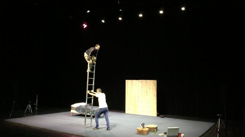 Dans la grande salle du ZEF, plongée dans le noir à l’exception de la scène, un duo de comédiens de la compagnie MMFF évolue sur scène. Le spectacle raconte l’histoire de deux hommes qui veulent monter un spectacle acrobatique, comportant notamment du lancer de couteaux. Pour cela, ils s’entraînent dans le seul espace dont ils disposent : la chambre, d’où le titre de cette pièce, “Dans ma chambre-Episode 02”. Édouard Peurichard, artiste de cirque, et Arnaud Saury, à la fois metteur en scène acteur, assurent la représentation dans des conditions réelles, malgré l’absence de public.