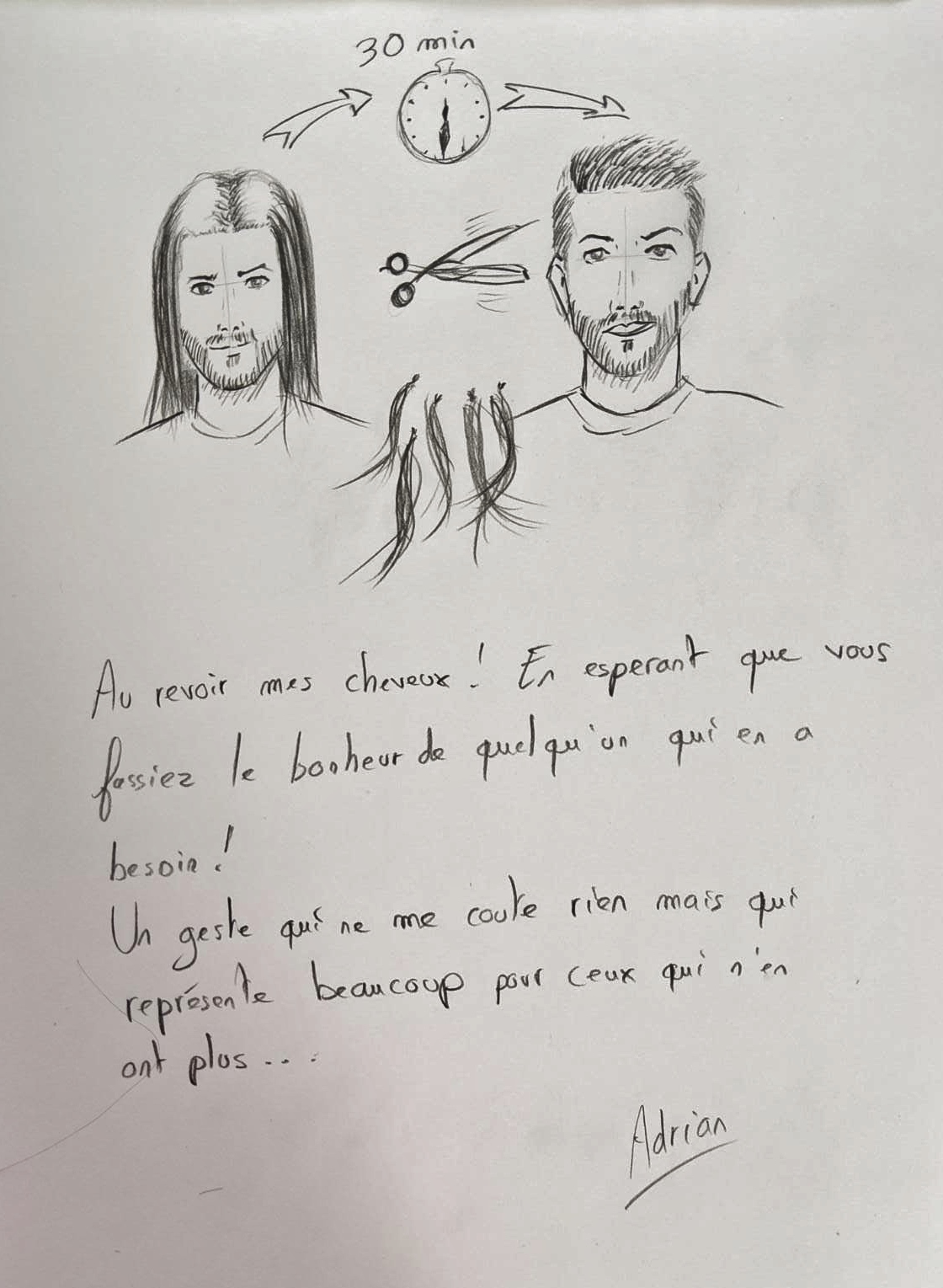 Je connais Adrian depuis le lycée. C’est un vrai ami, pas juste une connaissance. Jusqu’à récemment, je vous l’aurais présenté comme un dessinateur et photographe hors-pair – non sans un humour prononcé. J’ajouterai aujourd’hui qu’il a le cœur sur la main. À la fin du mois de novembre dernier, il a donné ses cheveux. Pratique étonnante, surtout venant d’un homme. Et sachant qu’il faut au moins 25 centimètres de longueur pour que le don soit conforme (bonus).