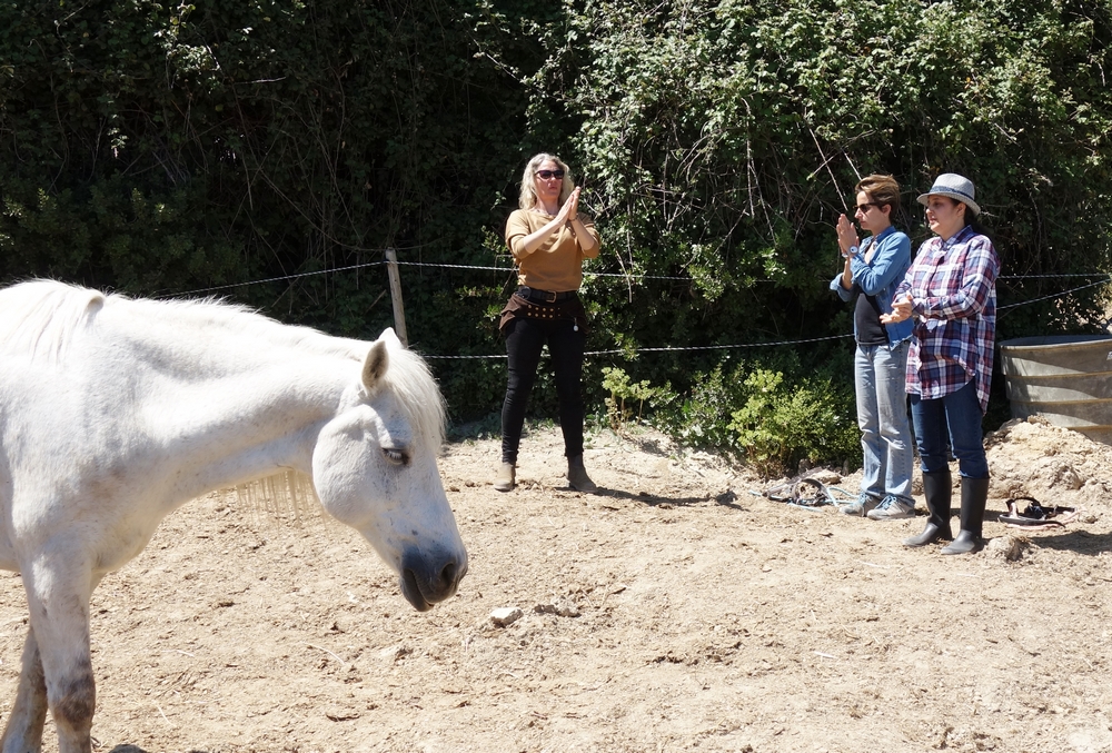 Le trio commence par un travail de respiration dans le champ où sont parqués les chevaux. Un bref moment de détente et de relaxation avant de s’approcher des animaux et de leur demander implicitement s’ils sont d’accord pour être réquisitionnés deux heures. Popeye et Skyline ne manifestent aucune opposition, bien au contraire. Après les avoir brossés et harnachés, les apprenties cavalières les emmènent dans l’un des cirques. Commence alors un « travail en main ». « On va s’atteler au positionnement. Plutôt que chacun soit dans sa bulle, le cheval et sa partenaire marcheront ensemble dans la même bulle », enjoint Yannique Bourglan. Les duos Mouna-Popeye et Alix-Skyline entrent en piste, suivent des chemins, stoppent dans des zones déterminées. Sans cris ni aucune brutalité. Les deux femmes font comprendre à leur monture par leur attitude ce qu’elles en attendent. Un travail qui associe activité physique, concentration, écoute, empathie.