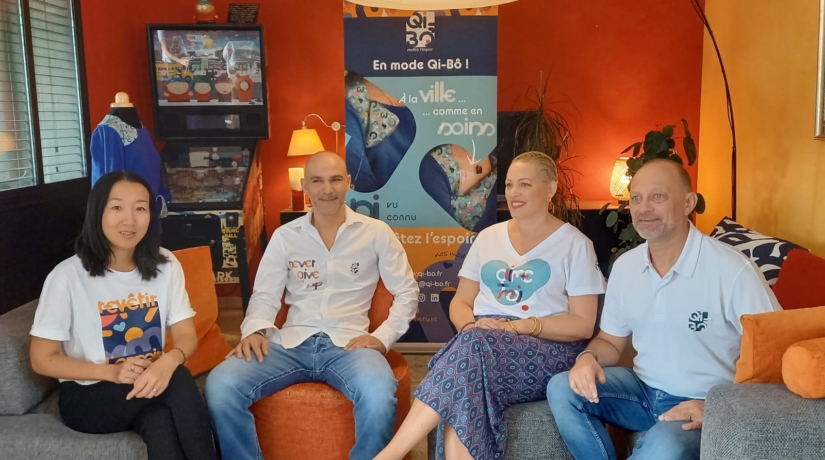 Tout part d’un constat : peu de vêtements sont adaptés aux besoins spécifiques des personnes atteintes du cancer et en cours de traitement. Pour corriger cela, Hélène a cofondé la marque Qi-Bô, une petite collection de hauts « conçus pour nous, colorés, doux, chauds, stylés, et qui peuvent se porter en soins comme à la ville ! »