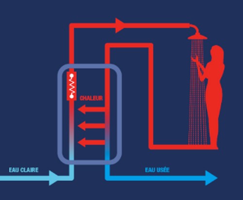 Concrètement, l’eau qui disparaît dans la bonde passe dans un tuyau spécial avant d’être évacuée. À savoir un échangeur thermique, où elle croise le circuit d’eau froide. Comme son nom l’indique, ce système permet de transférer la chaleur de l’un vers l’autre. L’eau froide récupère ainsi 84% de la chaleur de l’eau usée. Une petite résistance électrique complète le dispositif afin que l’eau sortant du pommeau puisse atteindre jusqu’à 42°C.