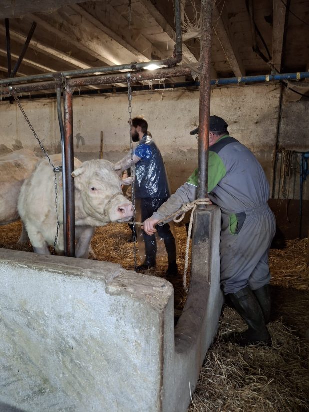 La césarienne de cette génisse se présente comme le meilleur choix pour la mère et le petit… L’éleveur participe à cette opération. ©ZC