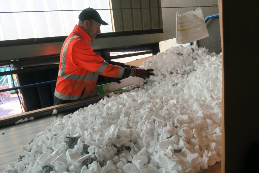 Jean-Pierre Guilbert, fondateur de La Feuille d’Erable, sur le site de Paulhan où le polystyrène recyclé est prêt à partir pour être réutilisé. © P. Guipponi