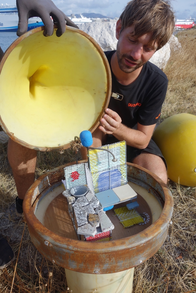 D’autres objets sont par contre plus insolites. Comme les épais tuyaux d’un bateau de transport de ciment, par lesquels s’écoulaient auparavant ses eaux de ballast. Ils attendent leur sort dans la « matériauthèque » de l’atelier, aux côtés de restes de pots de peinture – majoritairement bleue, blanche et rouge, couleurs des deux principales entreprises de transport de passagers au départ de Marseille –, d’anciens carreaux de cuisine d’un bateau (imaginez le nombre), d’une balise maritime et de beaucoup de planches de bois. Particulièrement des tins, des pièces utilisées en fond de cale dans les bassins de construction ou de réparation des navires (radoub dans le jargon). Un capharnaüm pour quiconque, un « bordel organisé » pour ces six créatifs.