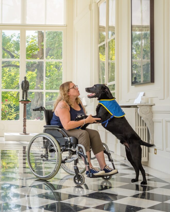 Nathalie Andréo : « Jagger est mon compagnon de vie. À part les aides à domicile, on est que tous les deux. Je souffre d’une maladie neurologique dégénérative. J’ai notamment des vertiges et du mal à coordonner mes mouvements. Jagger me suit partout pour voir si j’ai besoin d’aide ou si je ne vais pas tomber. Il ramasse les objets qui m’échappent, m’aide à défaire mes chaussettes, ouvre les placards, va chercher le camembert dans le frigo et le pose sur la table. Exactement à ma place ! Au supermarché, il me prend les produits dont j’ai besoin en bas du rayon et tend mon porte-monnaie à la caissière. Pareil chez la boulangère, sauf qu’elle fait le tour du comptoir pour me donner la baguette, sinon Jagger mangerait tout ! Il est avec moi depuis 2017.