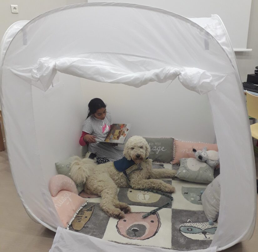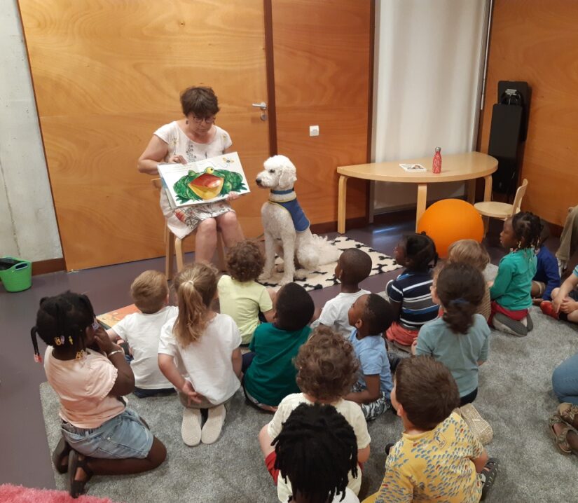Je propose également un atelier hebdomadaire ‘’Lecture au chien’’. Pendant six semaines, un enfant en difficulté de lecture emmène Plume à l’abri du regard et il lui lit un livre pendant 10 minutes. Le chien ne jugeant pas, n’interrompant pas, ne relevant pas les fautes, lui donne confiance et l’aide à progresser. Plume travaille entre 12 et 14 heures par semaine. Le reste du temps, elle se repose dans mon bureau, et le soir et le week-end, vit chez moi. En 2023, nous avons eu 1652 usagers aux ateliers avec Plume. Deux fois plus qu’en 2022 ».