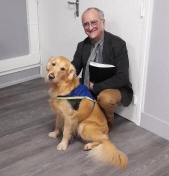 Pendant 15 jours, j’ai fait un stage pour apprendre les 52 ‘’commandes’’ qu’il avait déjà apprises : ‘’demi-tour’’, ‘’recule’ ’ ‘’tugg’’ pour ouvrir la porte, ‘’hop’’ pour monter sur les genoux, ‘’fais tes besoins’’, ‘’tête’’ pour lui mettre son collier, etc. Je continue à le faire travailler, car ma maladie ne va pas en s’arrangeant. À la fin de l’année, Jagger aura 10 ans, il sera à la retraite. Ça signifie qu’il n’aura plus le droit de me suivre au cinéma, au restaurant ou au supermarché. Il deviendra chien domestique et non plus d’assistance. Pas question d’en prendre un nouveau. Jagger restera avec moi jusqu’au bout. Mes commerçants sont d’accord pour continuer à l’accueillir ». ♦