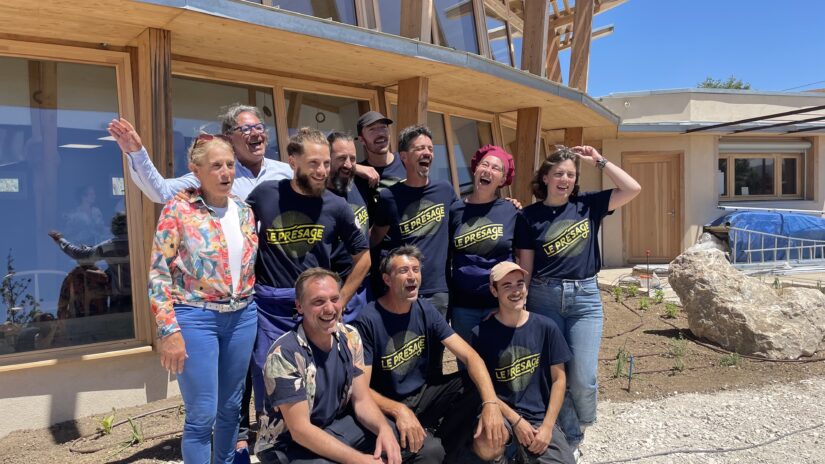 • De la vision idyllique à la réalisation. Le bâtiment du présage est bioclimatique (bois, béton de chanvre, orientation plein sud…). Il bénéficie d’une chaudière à granulés pour l’hiver. Et, sur son toit, de trois panneaux photovoltaïques (électricité) et de quatre panneaux biénergies (électricité et eau chaude). Pierre-André Aubert et ses associés ont dû cependant faire quelques compromis. « C’est tout l’enjeu entrepreneurial ». Par exemple, une partie du mur est « de l’agglo et non du bois ». Ils travaillent à améliorer le projet, notamment à transformer les déchets organiques en biogaz. Et à traiter les eaux usées pour arroser ses plantes.