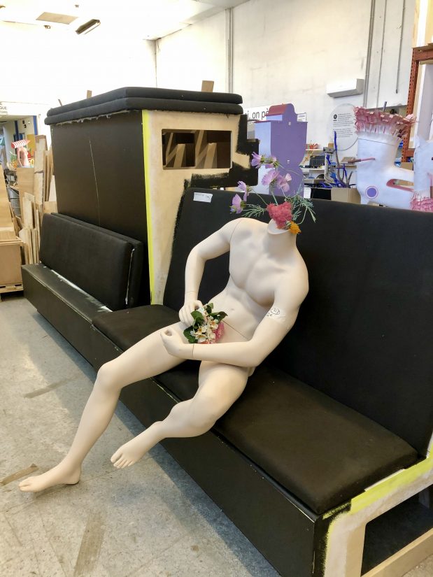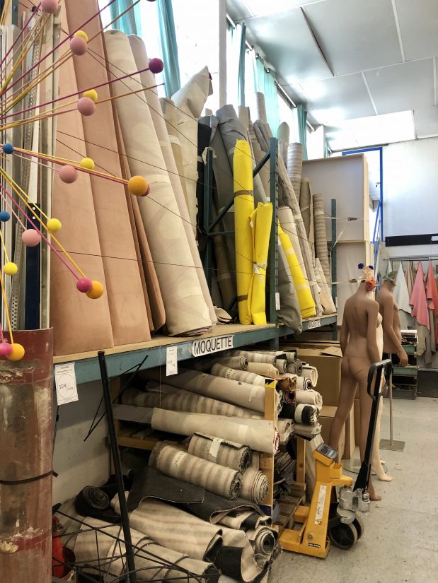 Dans cet entrepôt de 840 m2, qui fut « un call center puis une lingerie et enfin un détaillant en bijoux », se succèdent rouleaux de tissu, mannequins, chutes de bois et cuir, peaux entières, éléments de décoration et de scénographie, décors de tournages, rubans, passementeries, fournitures bijoux…