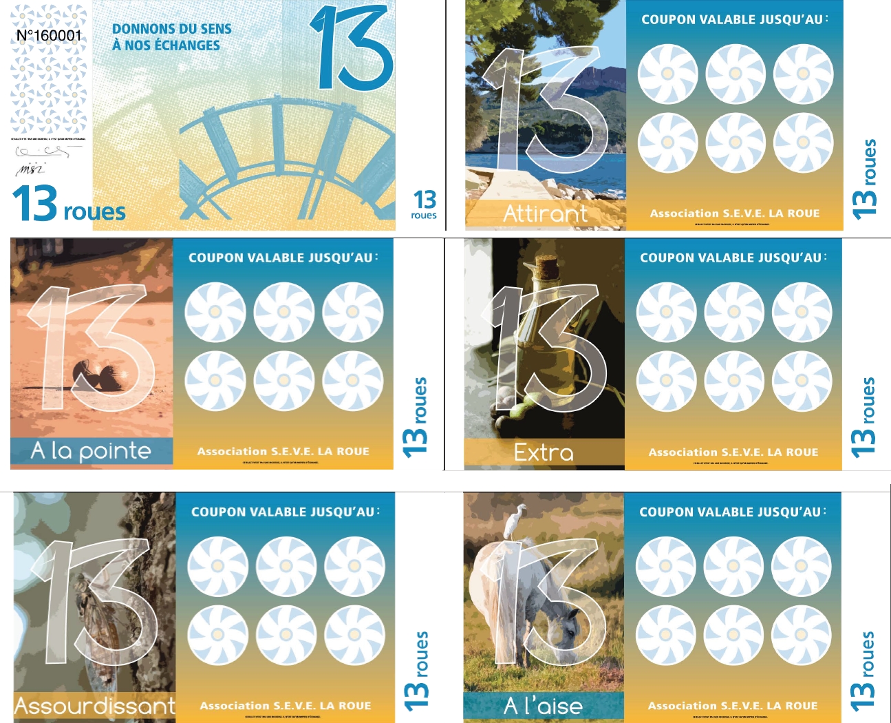 Parmi les autres actualités de La Roue, il y a la sortie d’un nouveau billet. Son montant est pour le moins insolite puisqu’il est de 13 roues ! « C’est un clin d’œil au département des Bouches-du-Rhône où on enregistre une bonne dynamique. Ce billet sera valable sur l’ensemble du territoire régional, mais ne sera émis que dans ce département », précise Mathieu Sarrasin. Si le recto ne varie pas, cinq versos différents ont été imaginés, avec des illustrations en référence au territoire – calanques, huile d’olive, cigale… – et un jeu de mot avec le chiffre 13 (voir photo ci-dessous). « On veut apporter un peu d’humour et toucher plus de monde pour sortir du cercle « bobo écolo » qui utilise la Roue ». Pour s’ouvrir au reste de la ville, l’équipe compte également former des « ambassadeurs » qui sauront parler de la Roue aux particuliers comme aux professionnels.