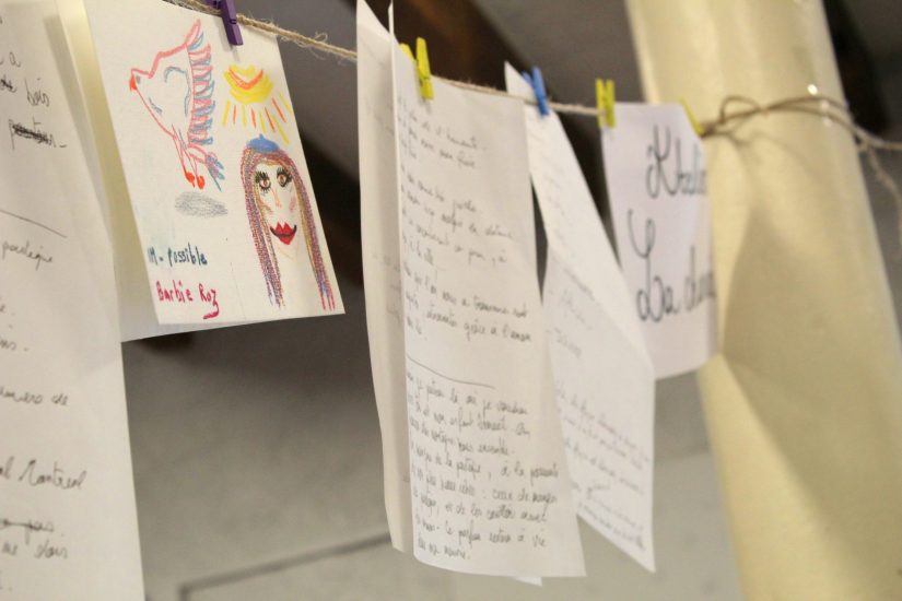 Dans le centre municipal d’animation des Chartreux, des textes et des dessins accrochés à des fils traversant la salle d’exposition. @MGP