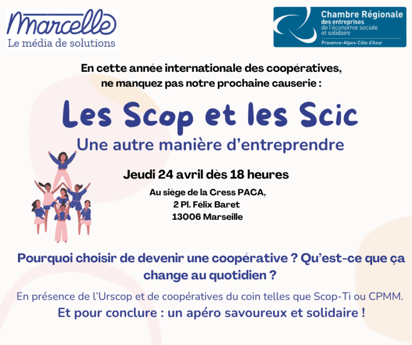 [au fait !] Avis aux curieux d’économie sociale et solidaire et aux entrepreneurs à qui le modèle coopératif fait de l’œil ! Le jeudi 24 avril à 18 heures, Marcelle et la Chambre régionale des entreprise de l’ESS PACA vous invitent à plonger dans le monde des sociétés coopératives.