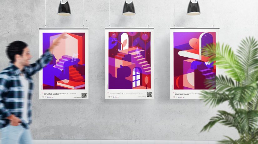 Des silhouettes dans un environnement très graphique, fait d’escaliers et de courbes, de superpositions de plans mêlant les tons rouges, bleus, violacés… Chacune des quatre œuvres qui composent l’exposition Tête-à-tête est à la fois anguleuse et enveloppante. Signées Louise de Crozals, illustratrice et graphiste à Lyon, elles ont vocation à être affichées dans des collèges et lycées, des médiathèques, des centres sociaux… Bref, des lieux accueillant un public adolescent.