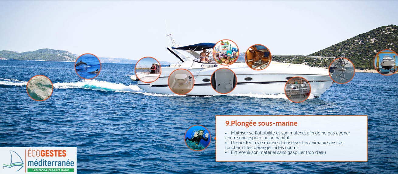 - La campagne ÉcoGestes Méditerranée. Il s’agit de la seule campagne de sensibilisation sur la façade méditerranéenne (Paca, Occitanie, Corse). Elle s’adresse aux plaisanciers pour les inciter à des changements de pratiques, à la fois en terme de comportements et d’équipement de leurs bateaux, dans l’objectif de réduire les impacts de leurs usages. Un guide de solutions simples à mettre en pratique regroupe une dizaine d’écogestes (à retrouver en cliquant ici). Cela va de l’ancrage à la gestion des hydrocarbures, des eaux noires et grises et des déchets à la consommation d’eau ou encore la pratique de la pêche et de la plongée.