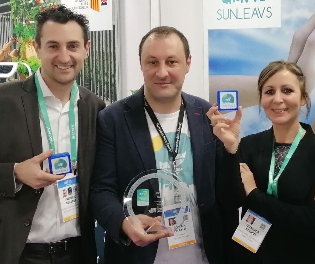 - Pas encore officiellement lancée et déjà primée ! Sunleavs a participé en janvier 2020 au CES (Consumer Electronic Show). C’est le plus grand salon de l’électronique dédié au grand public qui se tient chaque début d’année à Las Vegas. La jeune pousse varoise y a remporté un Climate Change Innovator Award, un prix décerné aux projets ayant le plus grand impact pour améliorer l’environnement et lutter contre le changement climatique via la réduction des émissions de gaz à effet de serre. Seulement six de ces prix ont été attribués cette année, dont deux en Europe. L’un à Sunleavs et le second à une autre start-up provençale, Green Systems Automotives, qui développe un dispositif réduisant les émissions de CO2 des deux roues. Toutes deux se connaissent bien puisqu’elles sont hébergées à la pépinière Cleantech située au technopôle de l’Arbois à Aix-en-Provence.