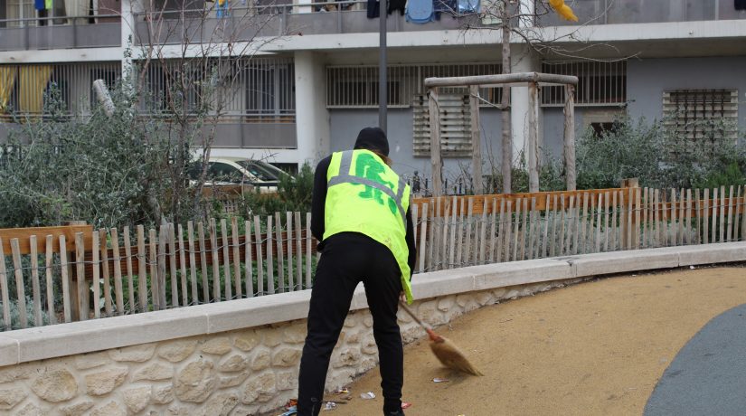 Après une courte pause, chacun se lève et s’arme d’un râteau pour nettoyer le sol et offrir un cadre de vie plus digne aux habitants du quartier. La matinée s’écoule et le soleil s’extirpe doucement de son lit de grisaille. Quelques passants ralentissent la cadence à la vue du chantier qu’ils observent de loin.