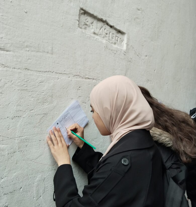 Durant le projet, ils partent sur les traces d’éléments qui racontent l’histoire de leur cité et de ses habitants, souvent en lien avec les discriminations – raciales, de genre, etc. : statues, plaques commémoratives, détails sur le fronton d’une maison. Pour ensuite débattre sur une thématique générale et actuelle. Par exemple, à partir d’une « trace » sur l’esclavage, ils échangent sur la discrimination liée à l’origine ethnique, puis la mettent en parallèle avec l’actualité contemporaine et ce qu’ils vivent. Ont-ils déjà été victimes ? Témoins ? La session, étalée sur deux jours, est clôturée par des travaux. Le plus souvent un reportage vidéo avec les habitants du quartier.