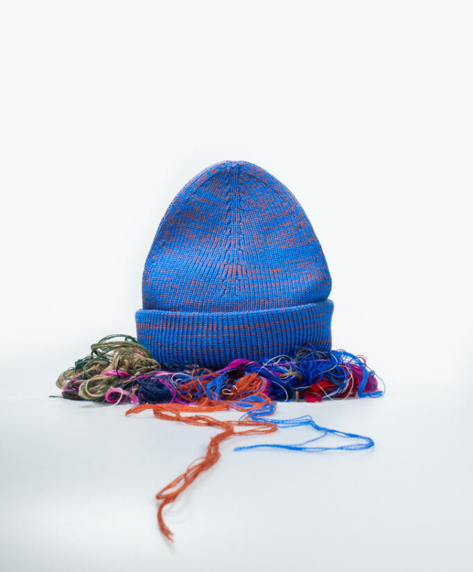 # Le bonnet fin de bobine. En laine mérinos et chiné, ce produit s’inscrit dans une démarche zéro déchet. Il est tricoté avec les fins de bobines qui pourraient être jetées. En effet, il arrive parfois que la quantité de fil restant soit insuffisante pour tricoter un plus gros produit. Or, en mettant toutes ces petites bobines ensemble, on obtient un bonnet chiné, qui sera toujours unique, en plus d’être écologique.