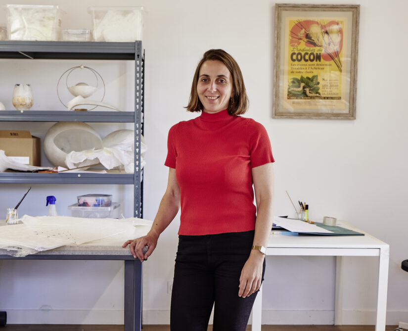 Le ver est dans le fruit ! Ou plutôt dans le cocon puisque c’est sur la soie et le processus de fabrication du fil de soie par la chenille du bombyx du mûrier que la jeune femme va porter son choix. « La soie et son histoire m’intéressaient et je me suis dit que je trouverais une façon de la travailler différemment. Ou en tout cas de façon originale ».