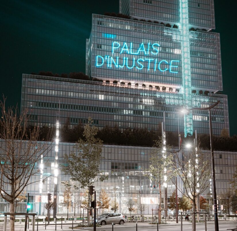 Notre Ohrage porte la voix de toutes les victimes secondaires à travers des actions artistiques : un clip diffusés sur les réseaux sociaux, des mots projetés sur les institutions judiciaires (ici à Paris) @Notre Ohrage